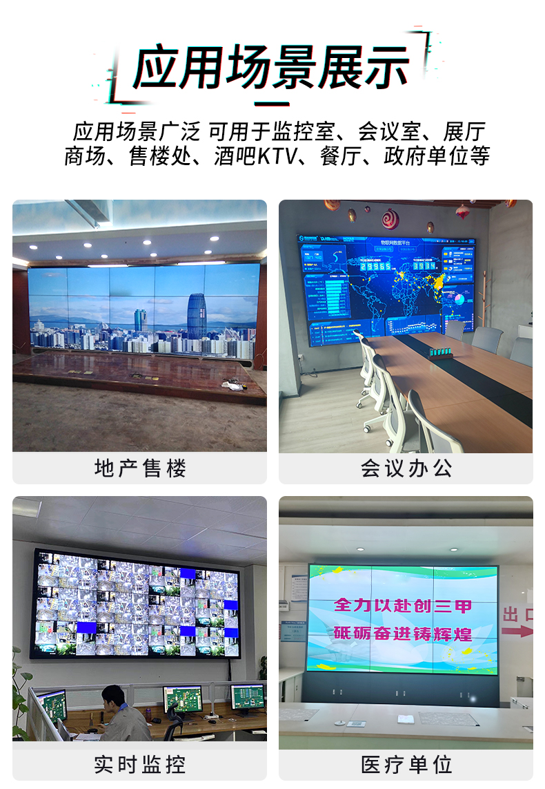 液晶大屏幕拼接顯示系統(tǒng)目前主要應(yīng)用于軍事指揮控制中心,政府機(jī)關(guān)、企業(yè)多媒體視頻會(huì)議顯示系統(tǒng),交通管理指揮中心,城市管理應(yīng)急指揮中心,生產(chǎn)調(diào)度控制中心,礦業(yè)安全生產(chǎn)監(jiān)控中心,商場(chǎng)、酒店、通訊信息顯示系統(tǒng),金融證劵信息顯示系統(tǒng),公安消防、氣象、海事防汛指揮中心、品牌專(zhuān)賣(mài)店形象展示系統(tǒng)等領(lǐng)域。